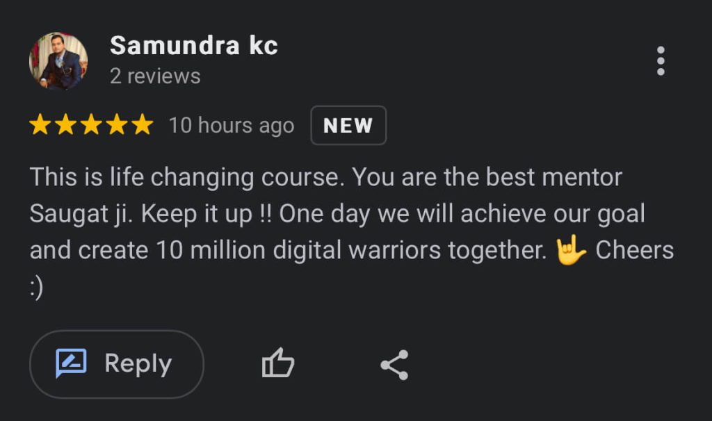 I’m the founder of Sikumna Nepal, and I’m on a mission to help 1,00,000 people build a freedom lifestyle using their digital skills.So far, I’ve trained over 10,000 students and received 1,100+ google reviews with an average rating of 4.9 stars.